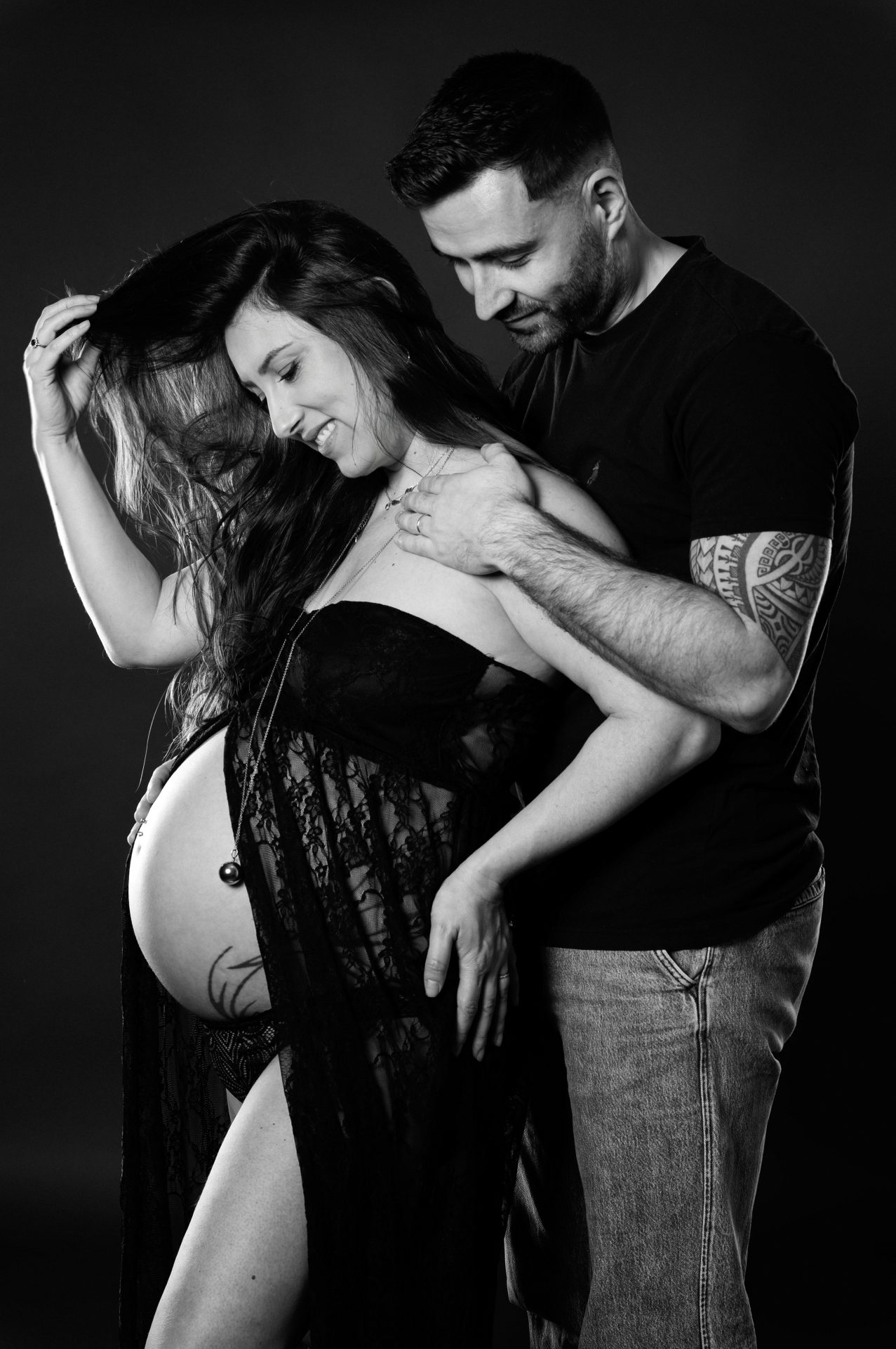 Lumière douce, fonds neutres et décor minimaliste. On crée ici des portraits artistiques et intimes. Le rendu est épuré, idéal pour mettre pleinement en valeur les courbes de la future maman dans un cocon de sérénité.